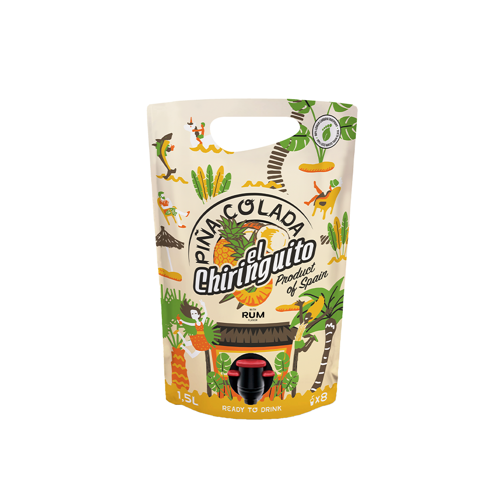 Piña Colada El Chiringuito comes in a 1.5 litre pouch. This packaging preserves it from light and keeps it in perfect condition for up to 8 weeks after its first consumption. In addition, it helps to preserve the cold once it is taken out of the refrigerator as it has an aluminium wall inside to preserve its correct serving temperature.